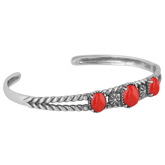 Sterling Silver Genuine Coral 3 Stone Friendship Cuff Bracelet Size Small - Large