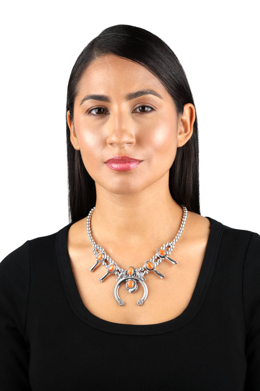 Sterling Silver Orange Spiny Oyster Squash Blossom Necklace, 17 to 20 Inches