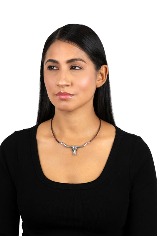 Sterling Silver Longhorn Skull Brown Leather Necklace, 17 or 20 Inches