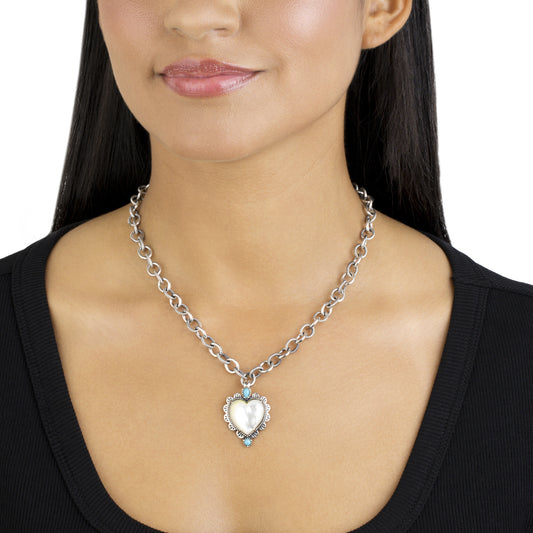 Sterling Silver White Mother of Pearl and Sleeping Beauty Turquoise Gemstone Heart Design Pendant Enhancer