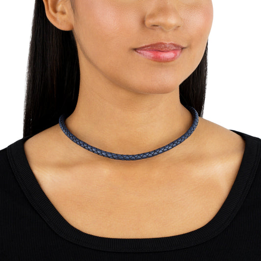 Braided Blue Genuine Leather Sterling Silver Necklace, 17-20 Inches