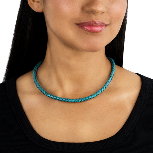 Braided Turquoise Genuine Leather Sterling Silver Necklace, 17-20 Inches
