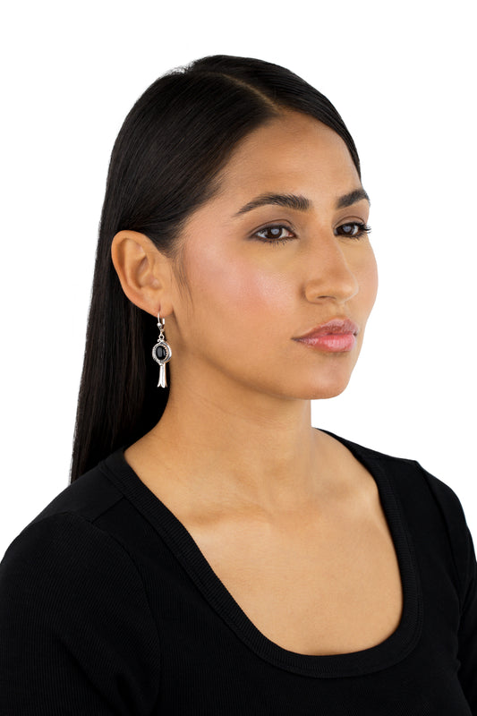 EXCLUSIVELY OURS! Sterling Silver with Black Agate Gemstone Leaf and Squash Blossom Design Women's Drop and Dangle Earrings