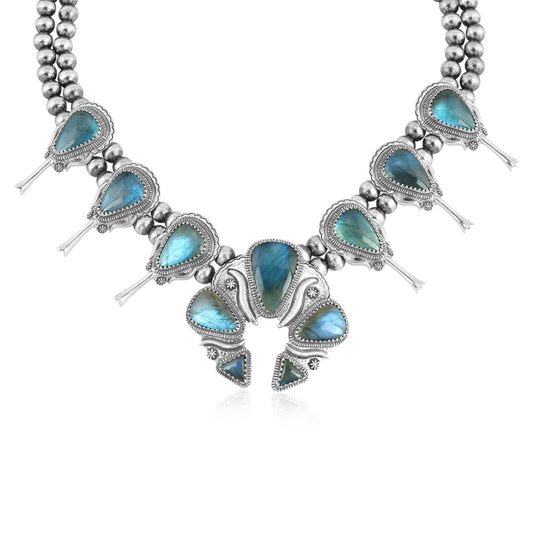 Sterling Silver Labradorite Large Naja Squash Blossom Necklace, 21 to 24 Inches