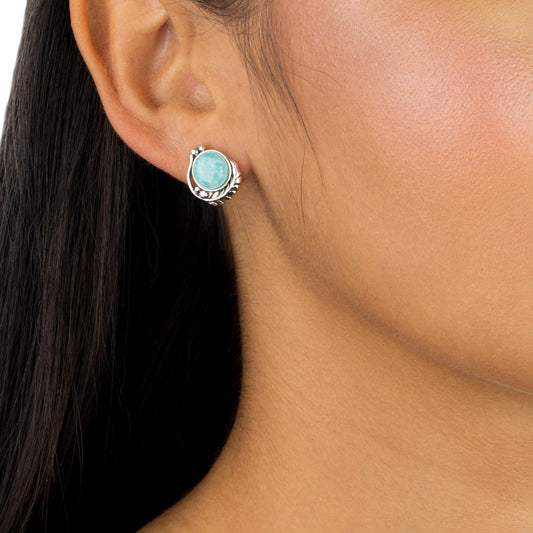 Sterling Silver Amazonite Gemstone Leaf Design Women's Button Earrings