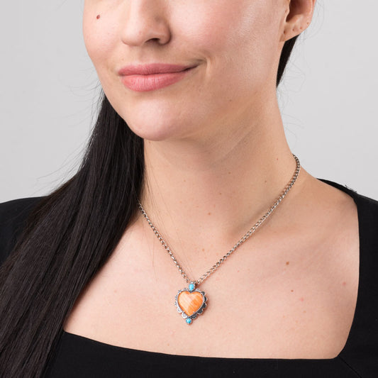Sterling Silver Orange Spiny Oyster and Sleeping Beauty Turquoise Heart Pendant Enhancer