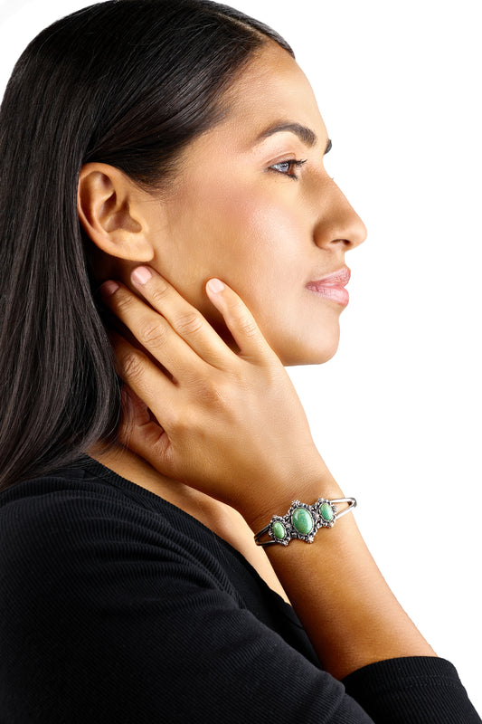 Sterling Silver Three Green Turquoise Oval Gemstone Cuff Bracelet Size S, M or L