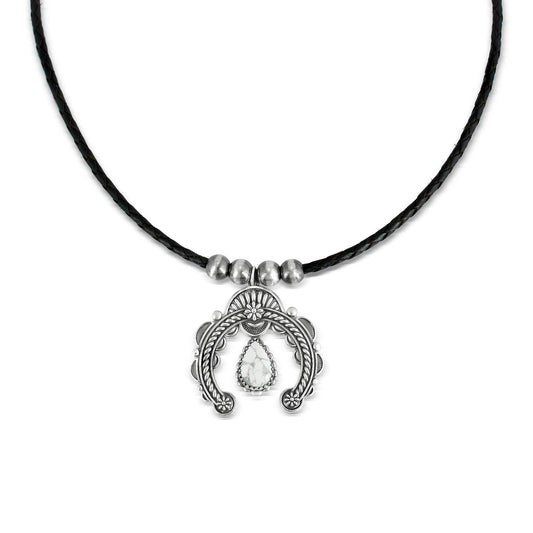 Sterling Silver White Howlite and Black Leather Pear Gemstone Naja Necklace, 17 to 19 Inches