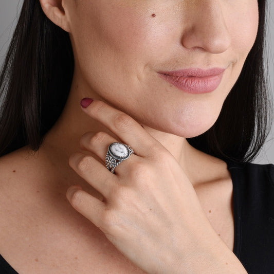 Sterling Silver White Howlite Gemstone Concha Flower Ring, Sizes 5 to 10