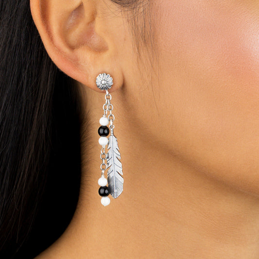 EXCLUSIVELY OURS! Sterling Silver with Black Agate and White Howlite Gemstone Feather Design Drop and Dangle Earrings
