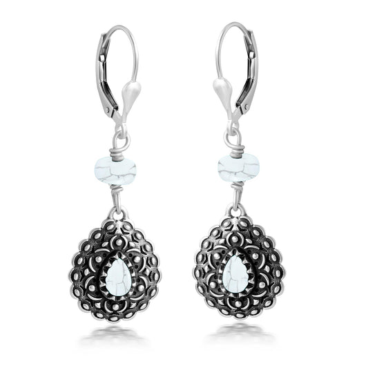 Sterling Silver White Howlite Pear-Shaped Concha Lever Back Earrings