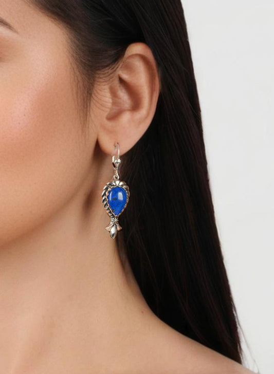 Sterling Silver Lapis Pear Gemstone Squash Blossom Lever Back Earrings
