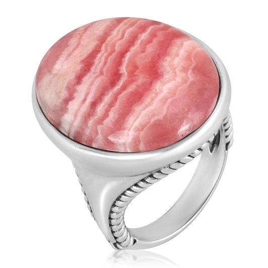 Sterling Silver Rhodochrosite Bold Oval Bezel Set Ring, Sizes 5 to 10