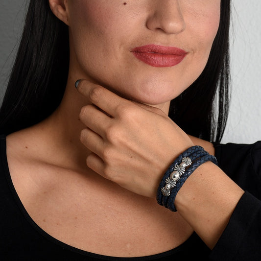 Sterling Silver Blue Braided Leather Coil Wrap Bracelet One Size Fits Most
