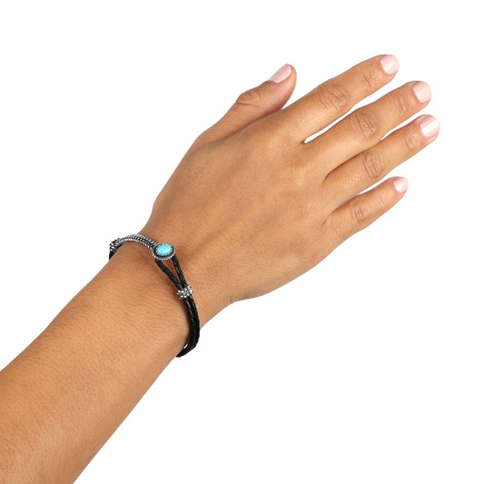 Sterling Silver Blue Turquoise and Black Leather Pear Gemstone Naja Necklace, 17 to 19 Inches