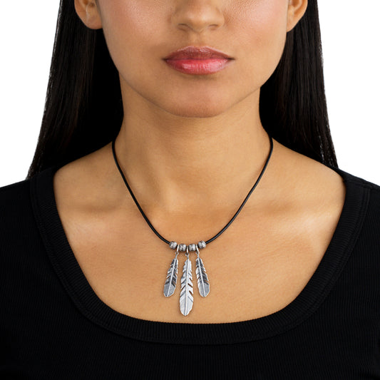 Sterling Silver Triple Feather Black Genuine Leather Necklace, 17 -20 Inches