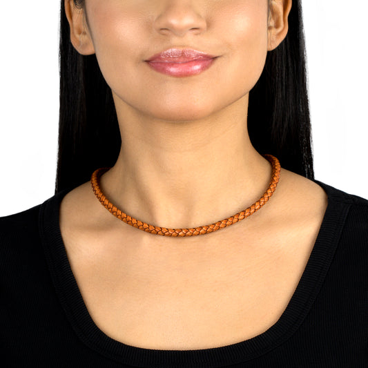 Braided Genuine Antique Orange Leather Sterling Silver Necklace, 17 to 20 Inches