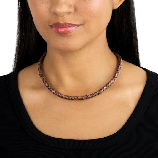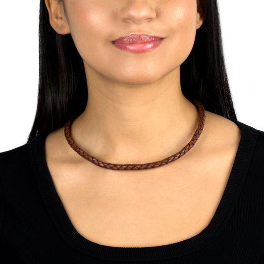 Braided Brown Genuine Leather Sterling Silver Necklace, 17 -20 Inches