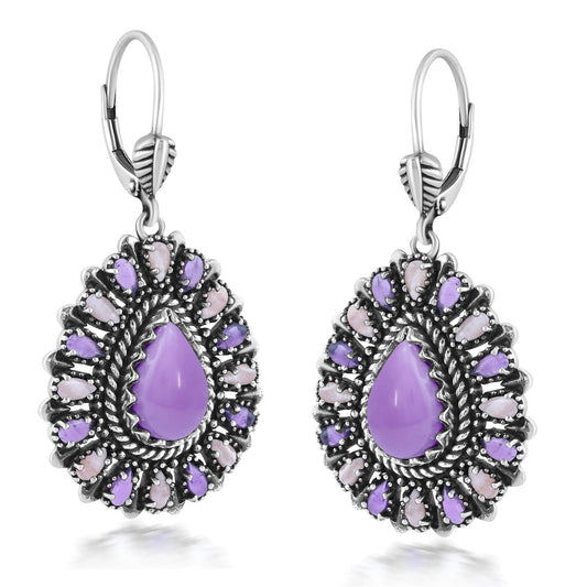 Sterling Silver Phosphosiderite, Rhodochrosite, and Amethyst Cluster Pear Shaped Dangle Earrings