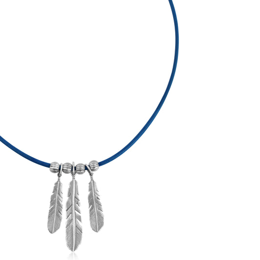 Sterling Silver Triple Feather Blue Genuine Leather Necklace, 17 -20 Inches