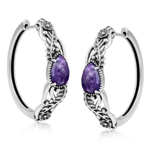 EXCLUSIVELY OURS! Sterling Silver Charoite Vine and Leaf Hoop Earrings