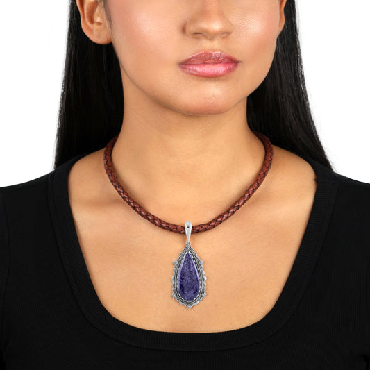 EXCLUSIVELY OURS! Sterling Silver Charoite Teardrop Bordered Design Pendant Enhancer