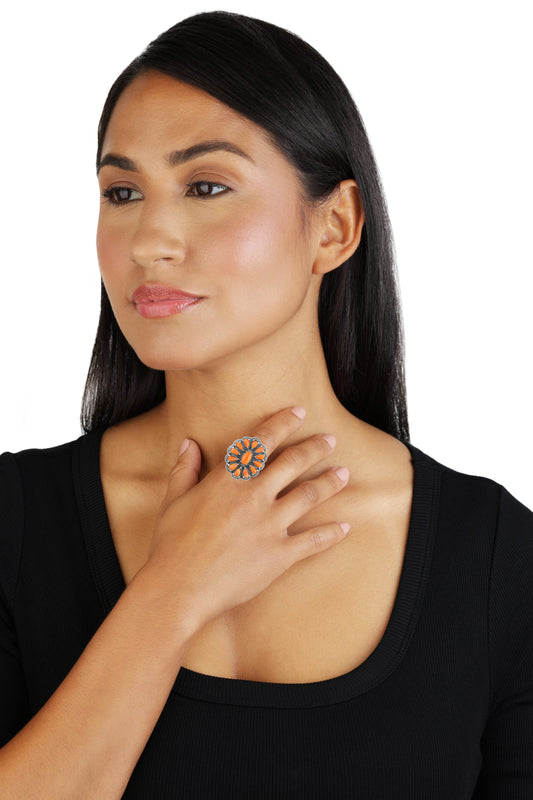 Sterling Silver Orange Spiny Oyster Gemstone Concha Flower Ring, Sizes 5 to 10