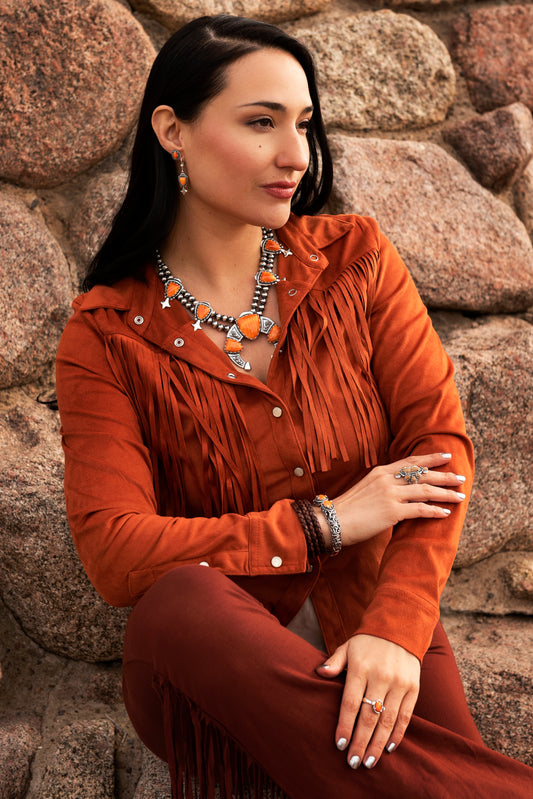 LIMITED EDITION! Sterling Silver Orange Spiny Oyster Trapezoid Squash Blossom Necklace, 17 to 20 Inches