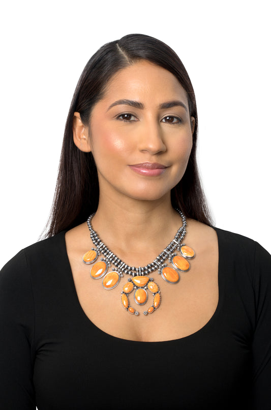 EXCLUSIVELY OURS! Sterling Silver Orange Spiny Oyster Naja Squash Blossom Statement Necklace, 17 to 20 Inches