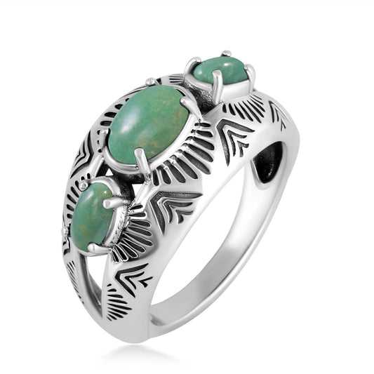 Sterling Silver Green Turquoise 3-Stone Oval Band Ring, Sizes 5 to 11
