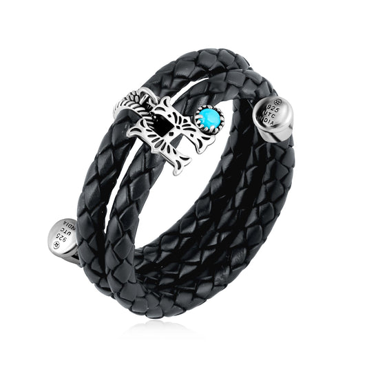 Sterling Silver Sleeping Beauty Turquoise Black Leather Initial "H" Coil Bracelet, 16 Inches