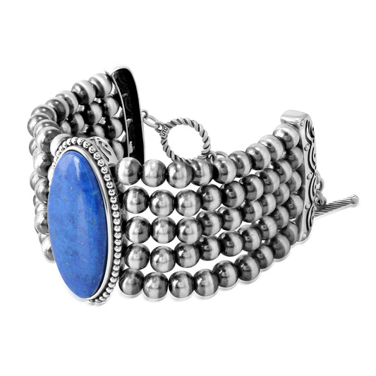 Sterling Silver Lapis Oval Cut Beaded Toggle Bracelet, Sizes Small to Large
