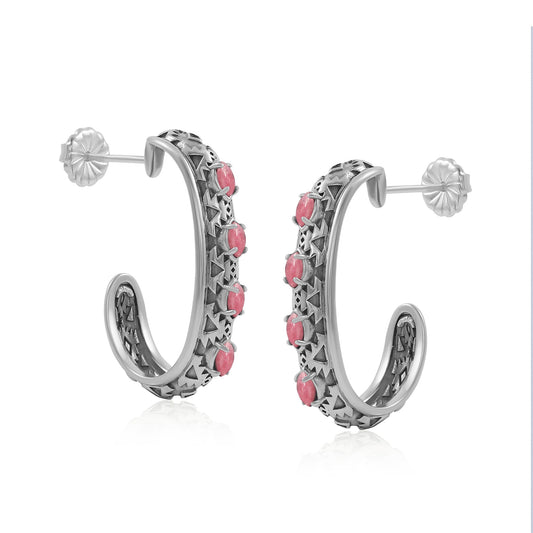 Sterling Silver Rhodonite Patterned J-Hoop 1 Inch Earrings