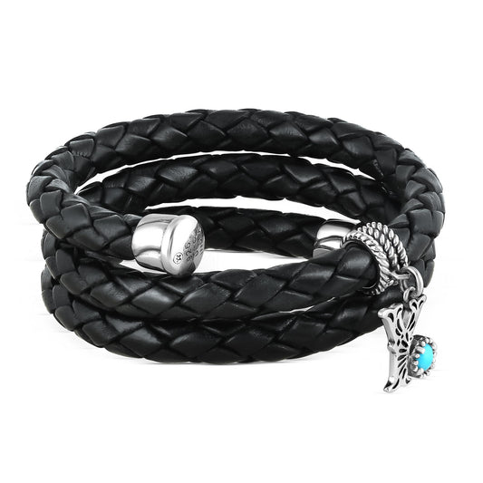 Sterling Silver Sleeping Beauty Turquoise Black Leather Initial "Y" Coil Bracelet, 16 Inches