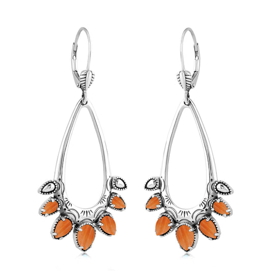 Sterling Silver Orange Spiny Oyster Open Pear Gemstone Lever Back Earrings
