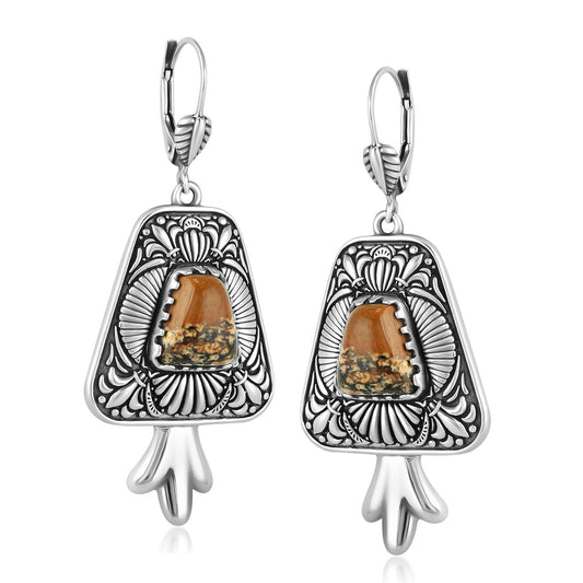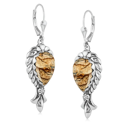 Sterling Silver Picture Jasper Pear Gemstone Squash Blossom Lever Back Earrings