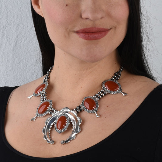 Sterling Silver Red Jasper Squash Blossom Naja Necklace, 17 to 20 Inches