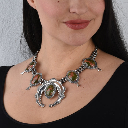 Sterling Silver Unakite Naja Squash Blossom Necklace, 17 to 20 Inches