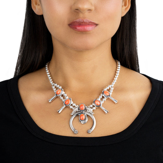 Sterling Silver Red Spiny Gemstone Squash Blossom Naja Necklace, 17 to 20 Inches