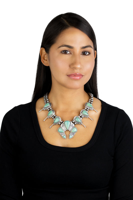 Sterling Silver Green Turquoise Squash Blossom Naja Necklace, 17 to 20 Inches