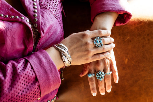 Western turquoise rings are exceptionally versatile. They can be dressed up or down to complement trendy, formal or casual looks. You can wear just one for an eye-catching statement piece, or stack them on multiple fingers for a luxurious boho look. They’re also popular among both men and women. You’ll find men’s and women’s turquoise rings here in a wide variety of sizes and styles so everyone can find the right sterling silver turquoise ring for them. No matter which one you choose, you can trust that your ring was designed in the American WestAmerica and handmade with care.
