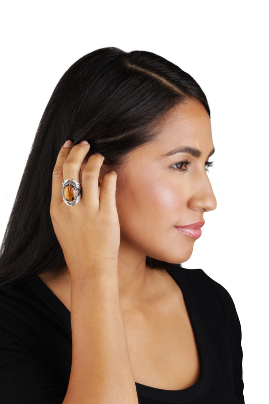 Sterling Silver Tiger's Eye Leaf Design Ring, Sizes 5 to 10