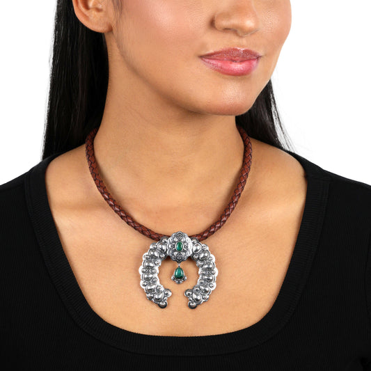 Sterling Silver Blue Turquoise and Black Leather Pear Gemstone Naja Necklace, 17 to 19 Inches