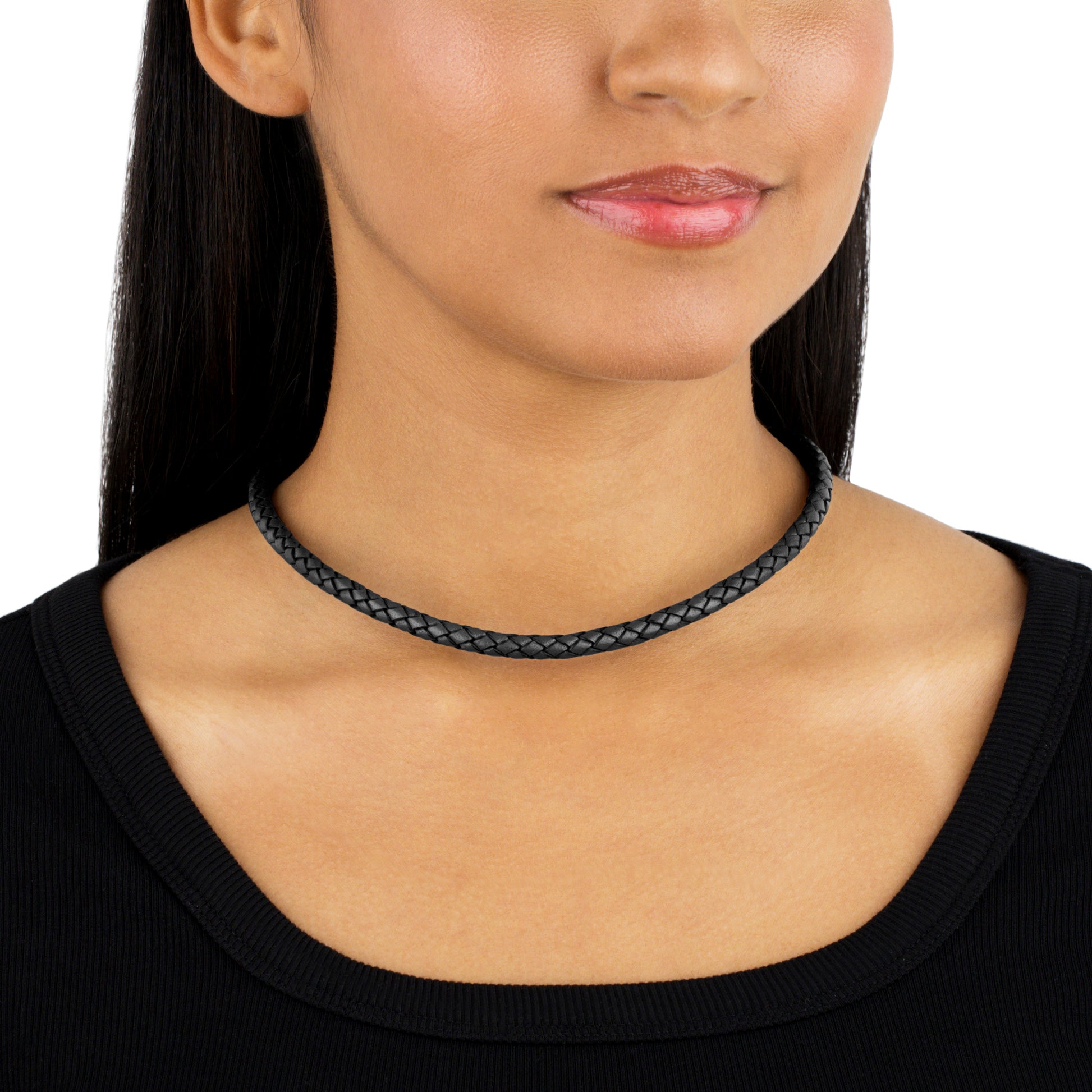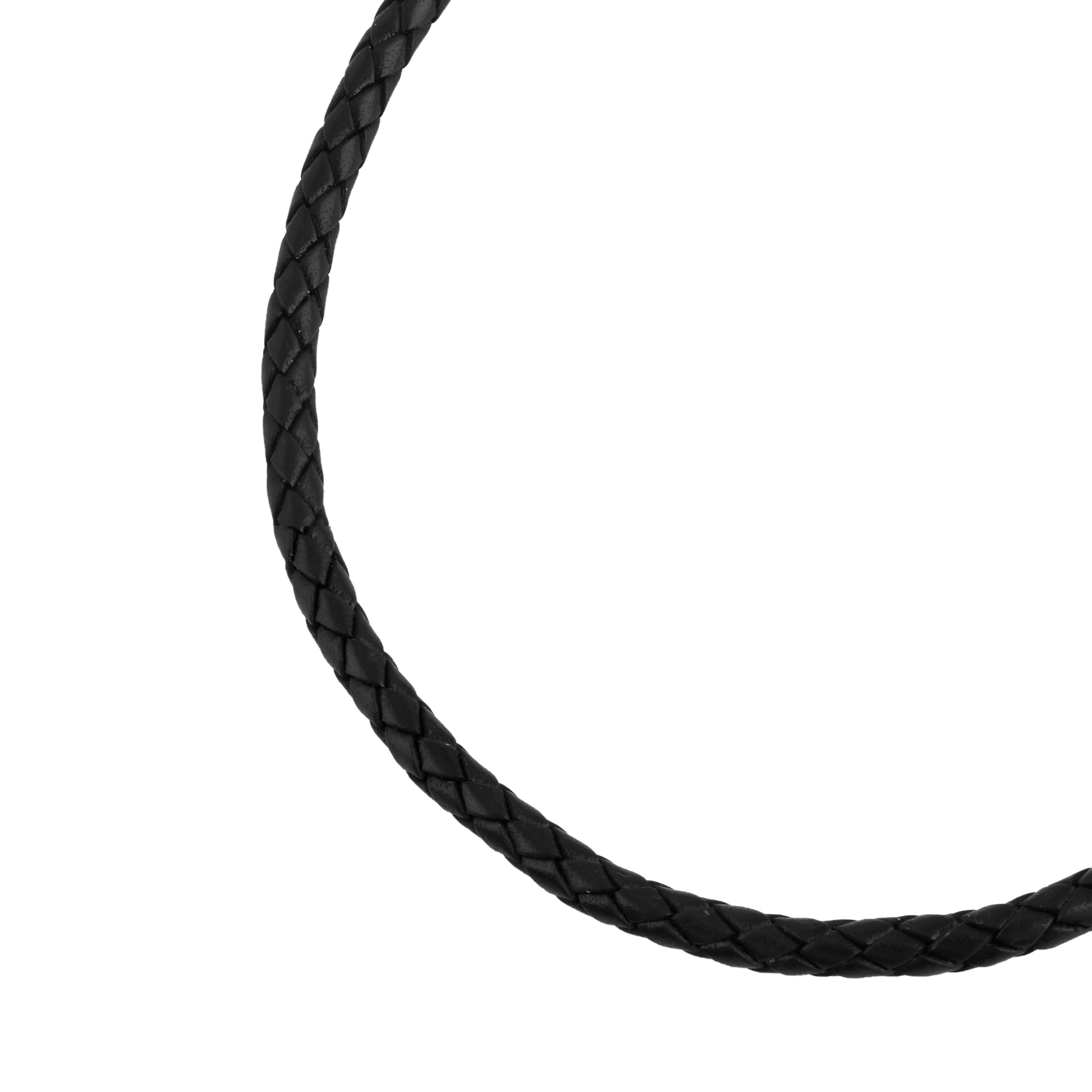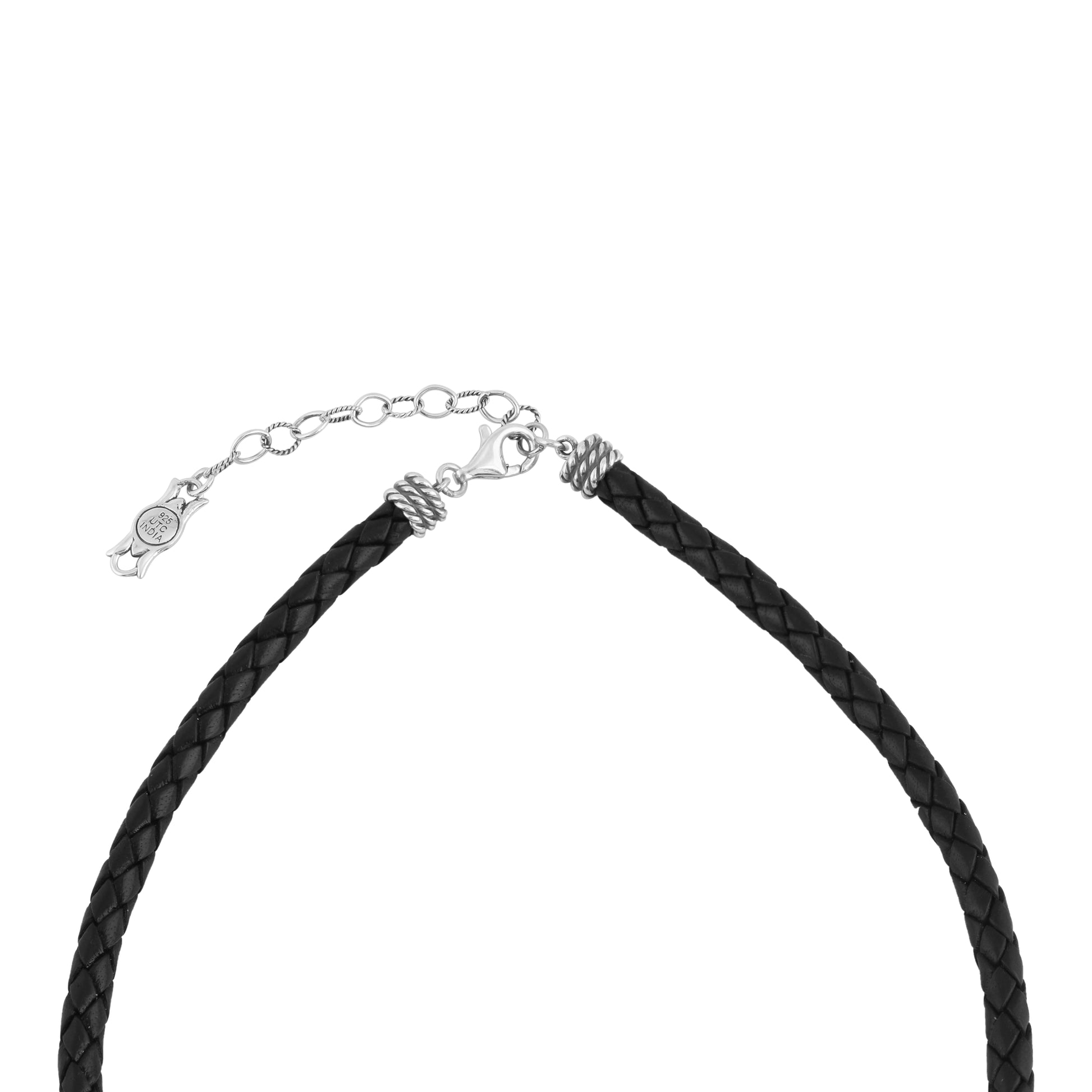 •Genuine braided black leather necklace with Sterling Silver end caps, clasp and extender chain; approx. 6.35 mm width; lobster claw closure
