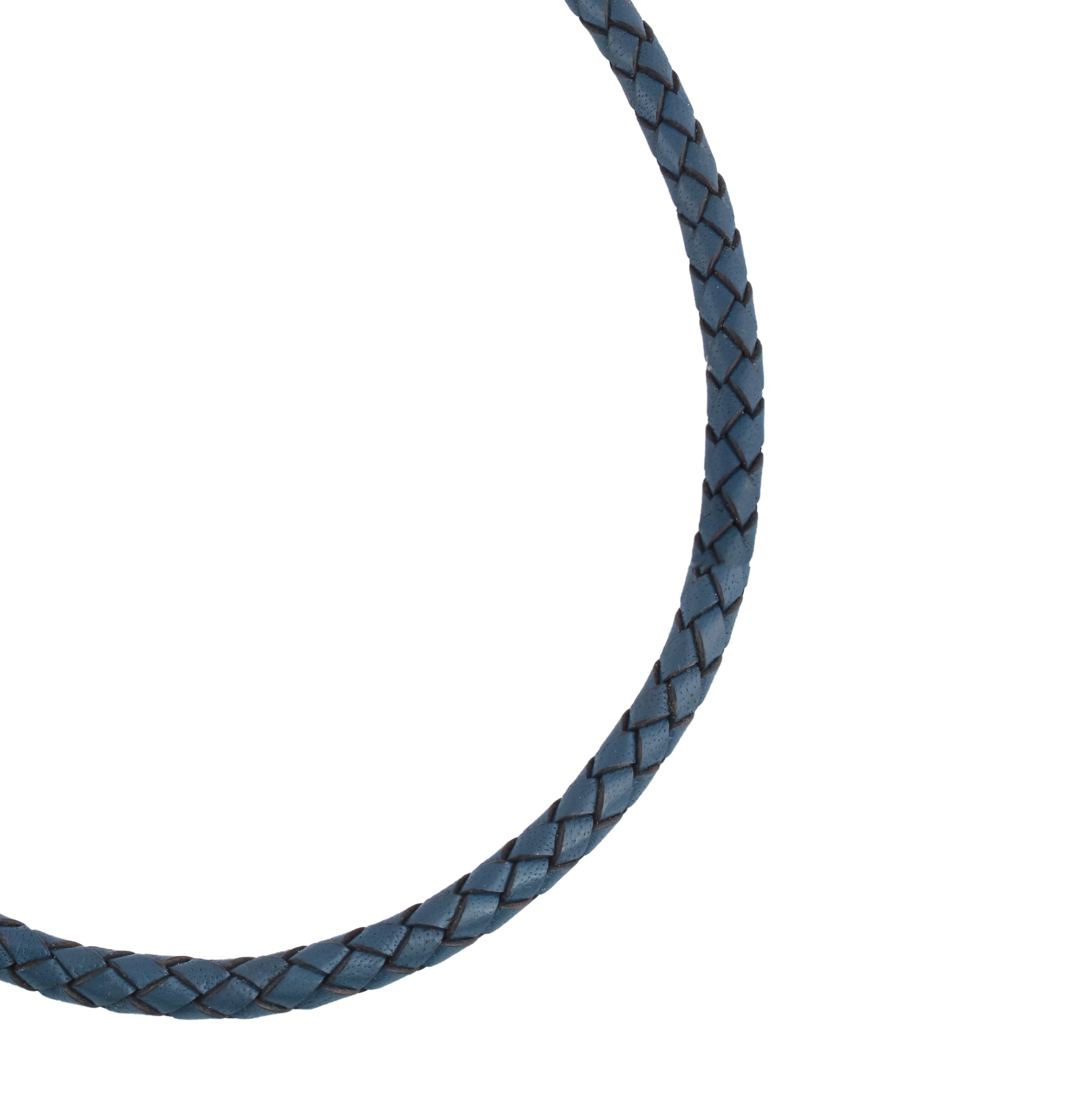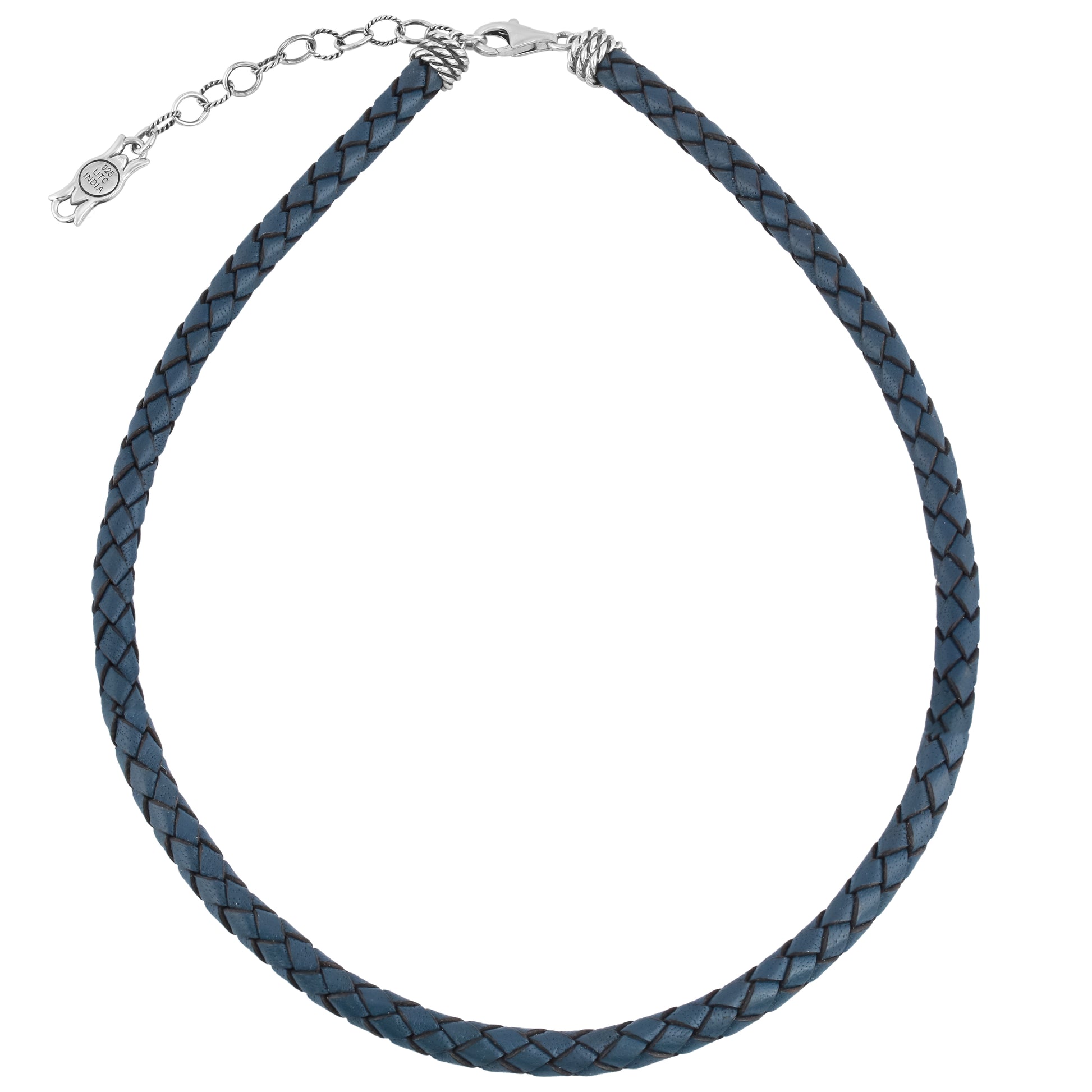 •Genuine braided blue leather necklace with Sterling Silver end caps, clasp and extender chain; approx. 6.35 mm width; lobster claw closure