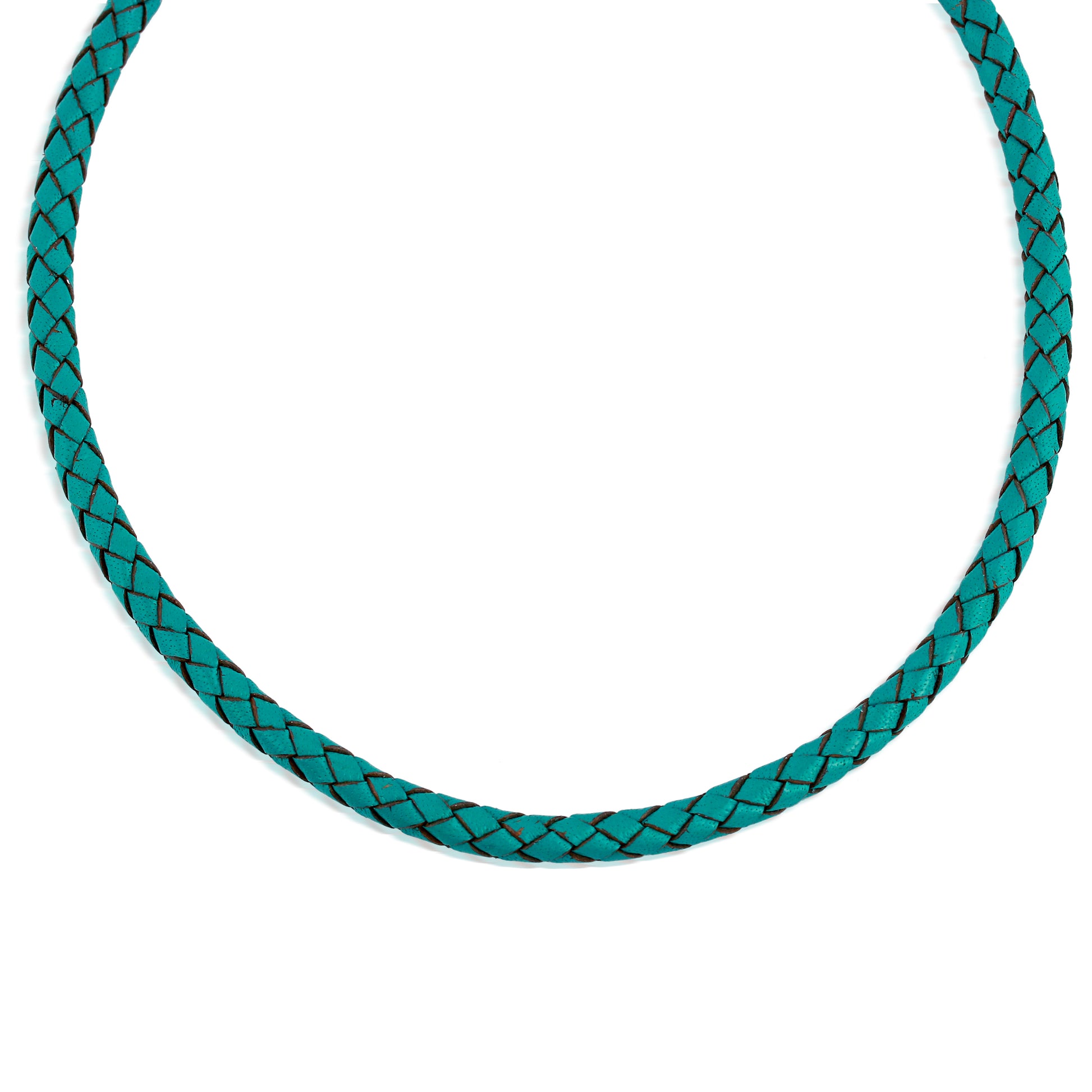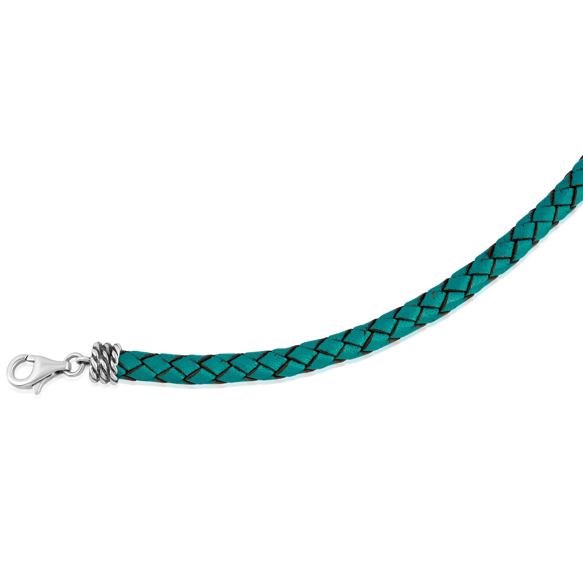 •Genuine braided turquoise leather necklace with Sterling Silver end caps, clasp and extender chain; approx. 6.35 mm width; lobster claw closure
