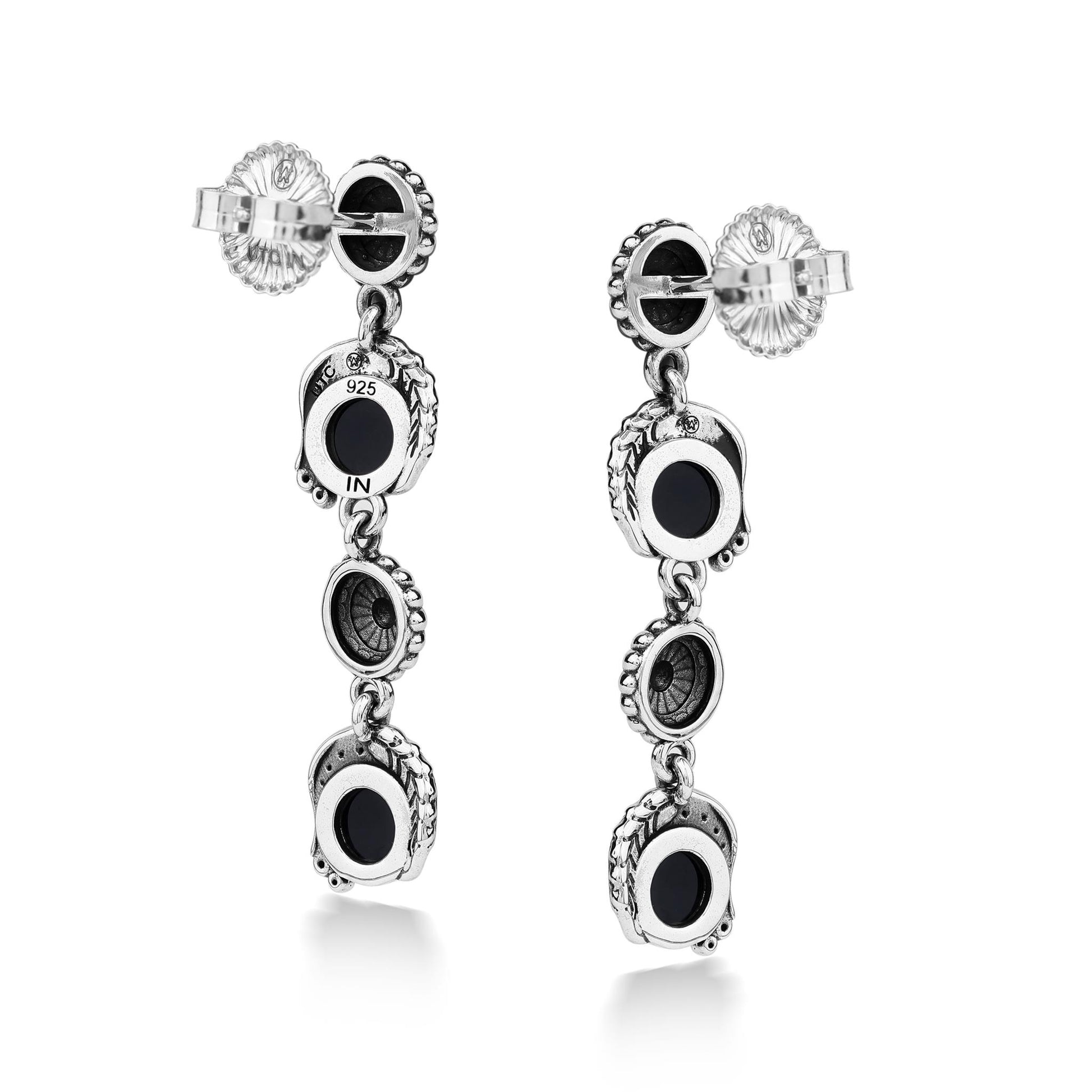 • Linear dangle earrings feature 6mm round-cut, bezel-set Black Onyx cabochons; Sterling Silver flower designs at post and center; bead and leaf accents; right and left design
