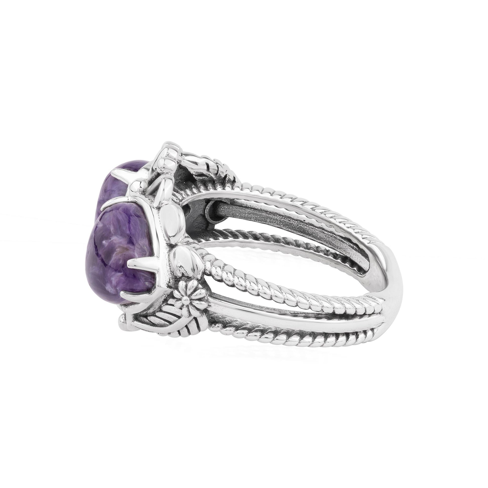 Isn't it romantic? The double heart represents eternal or everlasting love, unity, and deep affection, and this enchanting ring is the perfect symbol of harmony and emotional connection. It starts with two prong-set heart-shaped Charoite cabochons at its center, and is framed by leaf and rope detailing with concha flower and beaded accents. The split-shank band is textured in a double rope design and tapers in the back for comfort. Charoite has calming, healing properties and can provide emotional support. It’s often associated with reducing stress, grounding energies, and enhancing spiritual awareness. Every gemstone in the world is naturally unique, just like you! We carefully select the GIA certified gems for each piece, making your ring one-of-a-kind. You will find it will elevate any outfit! Whether at work, a date night with your honey or a special party or event– American West Jewelry will get you noticed. Get ready for compliments!