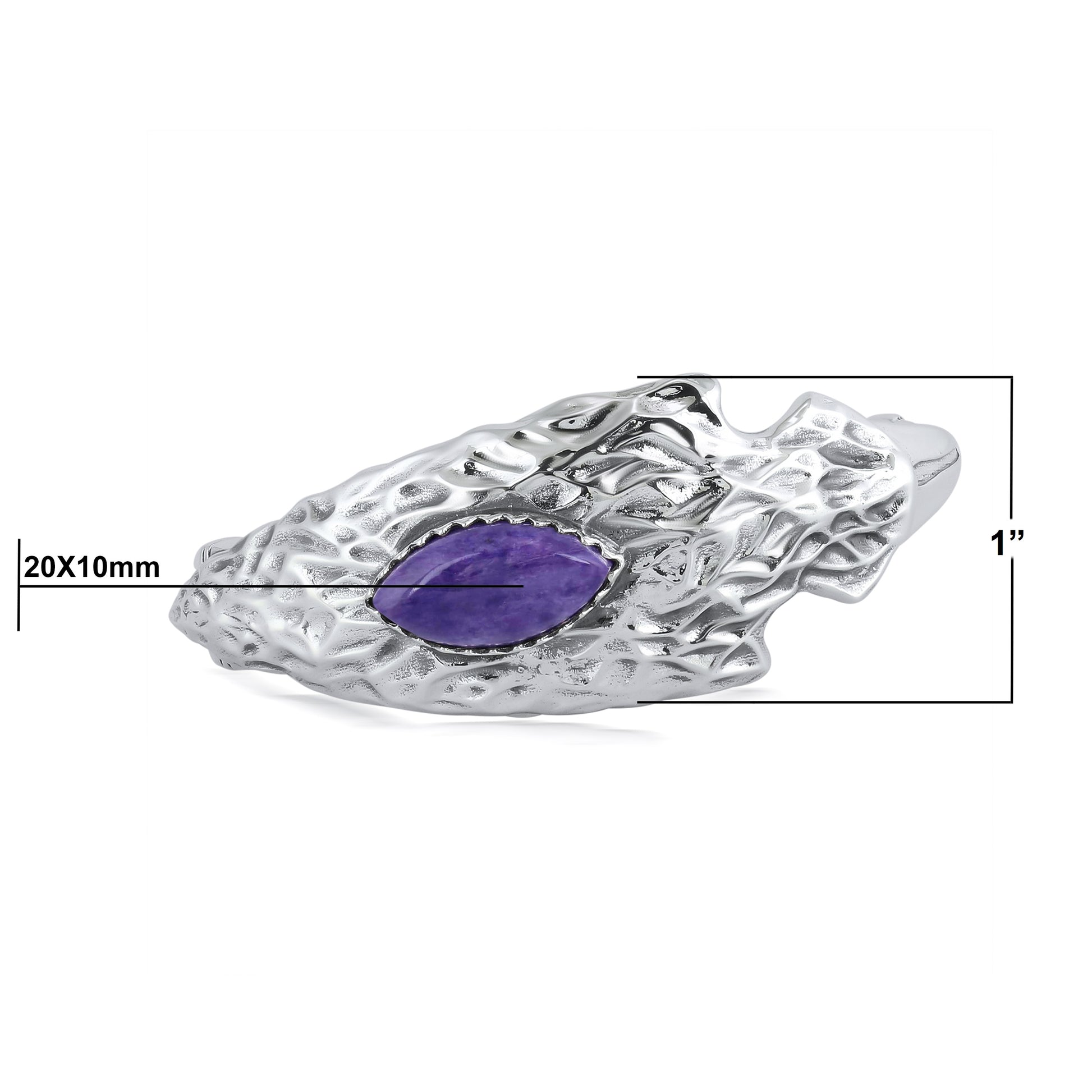 • Fritz Casuse-designed open cuff bracelet with 10x20mm marquise-cut Charoite cabochon; serrated bezel setting on a hammered, textured  Sterling Silver arrowhead