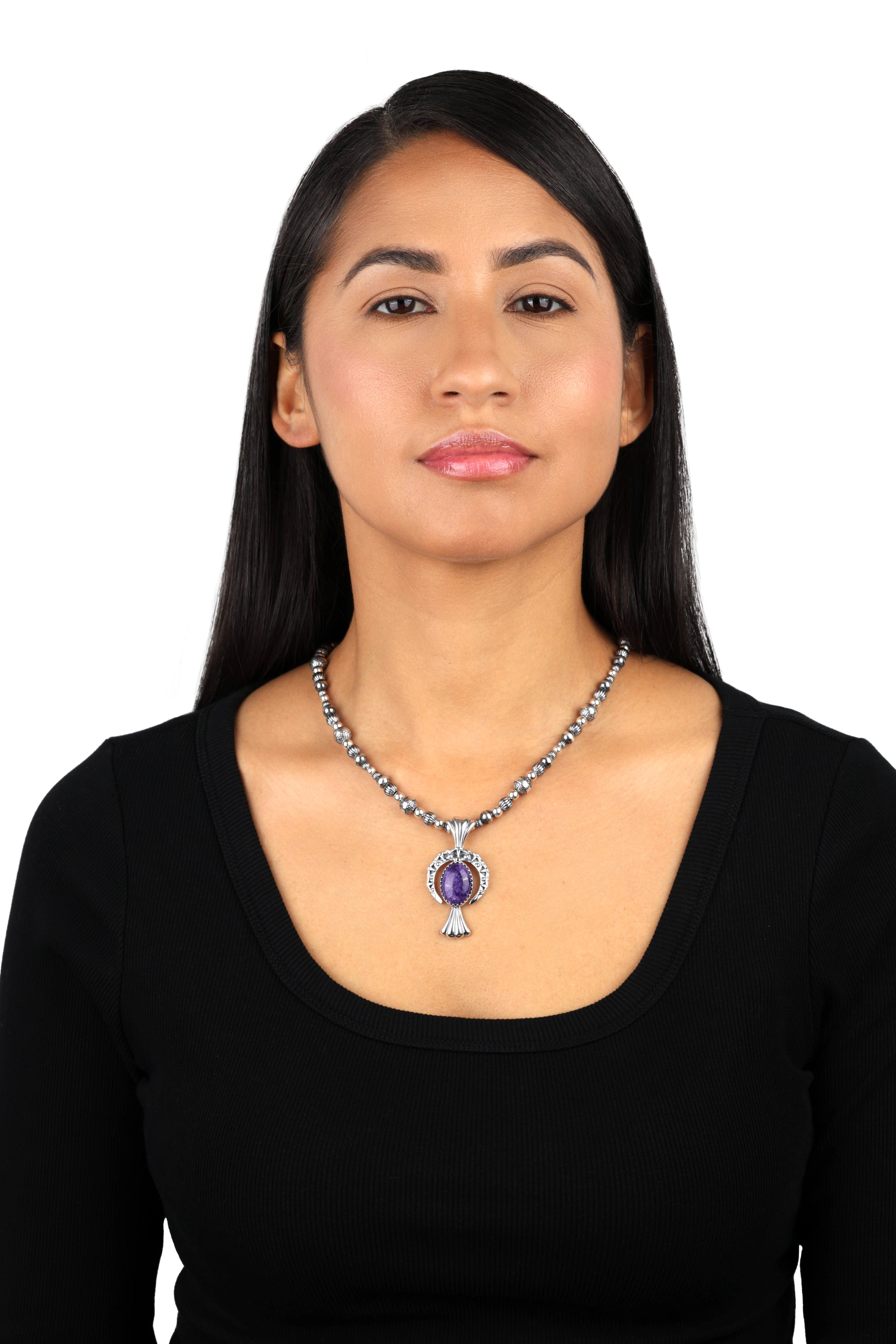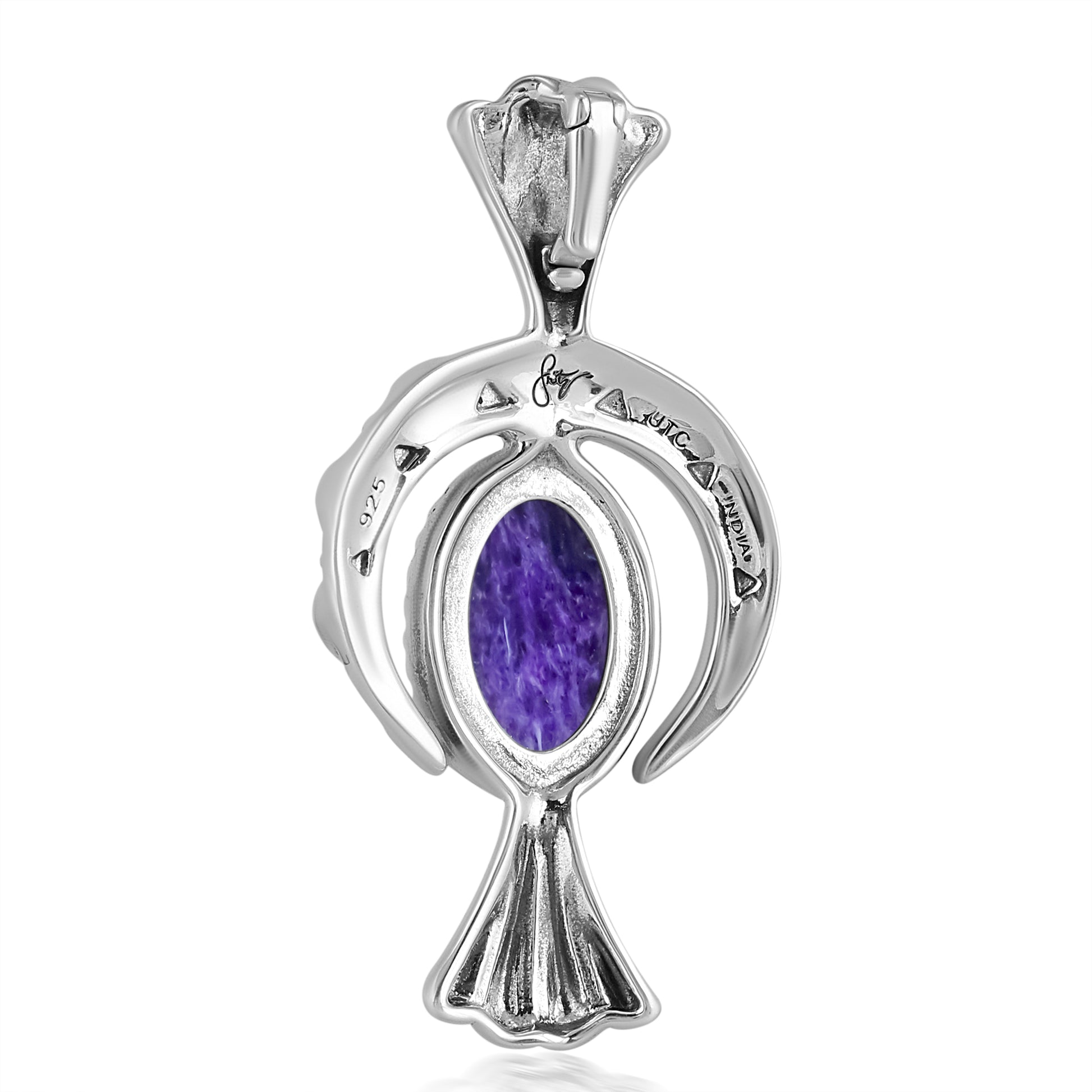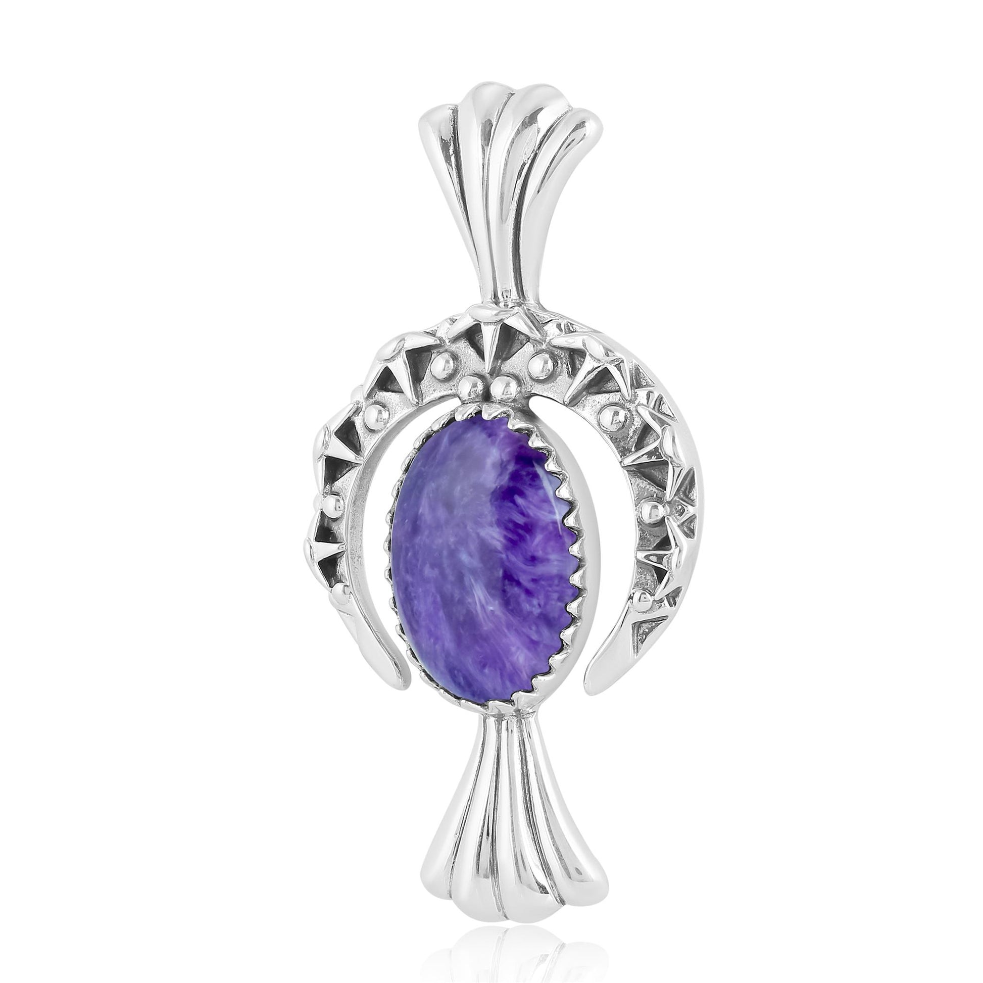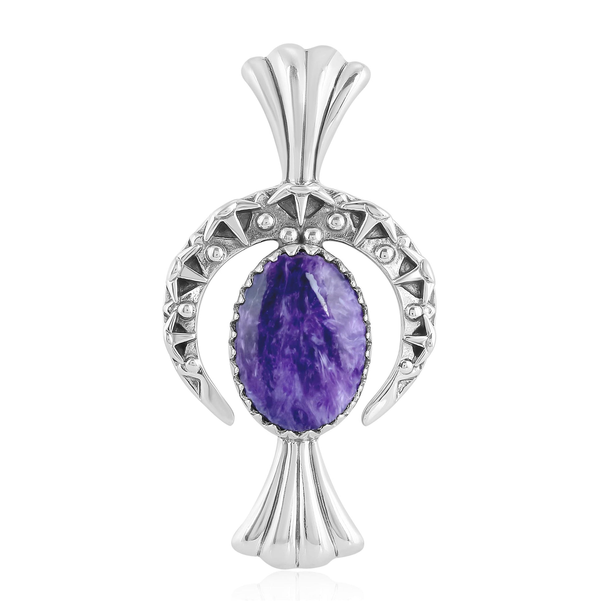 Fritz Casuse is an award-winning Navajo jewelry artist known for his innovative, sculptural designs that combine traditional Native American elements with modern aesthetics. His intricate pieces often feature dynamic shapes and textures, showcasing Sterling Silver and genuine gemstones to create bold, storytelling jewelry. This naturally colorful Southwestern Sterling Silver Pendant Enhancer features a naja crescent moon shape design adorned with an oval-shaped Charoite gemstone in the center and a silver squash blossom below. This exclusive pendant measures 1 inch wide by 2 inches long. A hidden snap hinge bail accommodates most chains and cords. Many believe Charoite has calming, healing properties and can provide emotional support. It’s often associated with reducing stress, grounding energies, and enhancing spiritual awareness.
